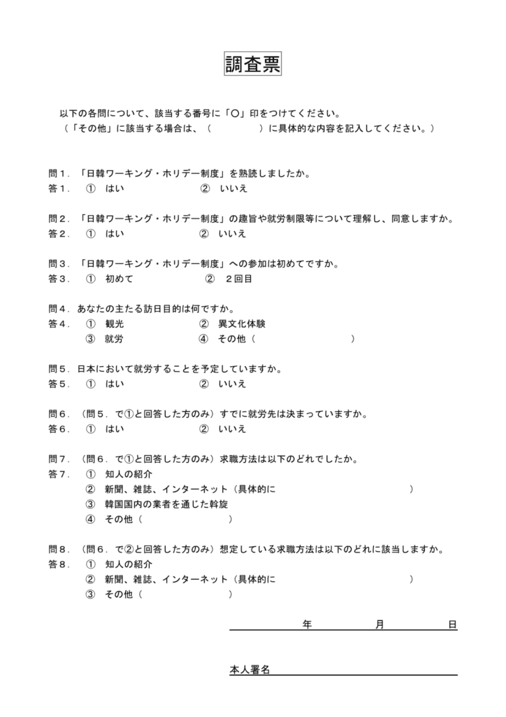 일본 워홀 조사표란, 신청자의 제도 이용에 관한 목적, 의도 등을 묻는 서류를 말합니다.