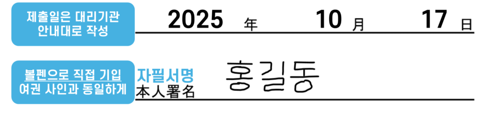 • 자필서명 누락은 일본대사관에서 안내하는 '자주 있는 불합격 예시' 중 하나입니다.
